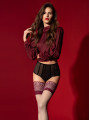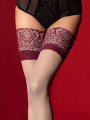 - Burgundy lace top — wide, ornamental floral band keeps the stockings securely in place.