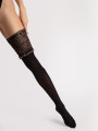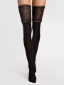 - Wide lace top — intricate floral lace band with silicone strips keeps stockings securely in place without a garter belt.
