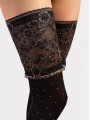 The FIORE Notte hold-ups are 40 denier women's hosiery featuring a metallic gold polka dot pattern on a semi-opaque black leg. These patterned thigh-highs combine the warmth of soft microfiber with a luxurious, gold-threaded lace top that frames the upper leg. The subtle lurex shimmer creates a sophisticated evening look while keeping legs warm.