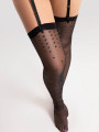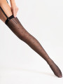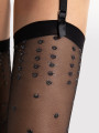 The FIORE Lurex Dot stockings are 15 denier sheer belt stockings featuring a cascading silver polka dot pattern. Designed to be worn with a suspender belt, these black women's hosiery combine a transparent leg with sparkling metallized yarn that catches the light like fresh rain. The pattern changes intensity down the leg for a dynamic, elegant look.