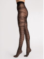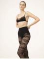 The FIORE Aquarius tights are 30 denier patterned pantyhose that combine two distinct worlds: a romantic floral motif at the top and a geometric wave pattern on the legs. This black women's hosiery creates a unique visual contrast, blending botanical leaves on the thigh with a rhythmic scalloped design down the leg for a look that balances nature and structure. One pair. Two stunning visual effects.