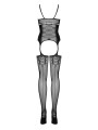 The Obsessive G314 bodystocking is a captivating piece of women's lingerie designed for confidence and allure. This black bodystocking features a delicate mesh material with a bold binding-style pattern that runs along the front and back. The open-cut design adds a spicy touch, making this black lingerie a perfect choice for romantic moments.