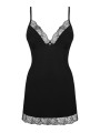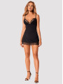 The Obsessive Bella Rou chemise set is a charming piece of women's lingerie that combines classic elegance with modern details. This black chemise features beautiful embroidered tulle at the neckline and a deep, open back design. The Obsessive Bella Rou set includes a matching black thong for a complete look.
