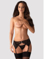 The Obsessive Charms lingerie set is an enchanting two-piece collection of women's lingerie designed to make you feel confident. This black lingerie set combines soft, elastic fabric with intricate floral lace details. The set includes a decorative garter belt and a matching mesh thong, perfect for creating a coordinated and elegant look.
