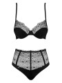 The Obsessive Sharlotte lingerie set is a striking two-piece collection of women's lingerie that combines modern style with functional support. This black lingerie set features a non-padded underwired bra paired with a matching high-waisted thong. Crafted from unique circular lace, this black set provides a confident and beautiful look for various occasions.
