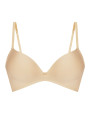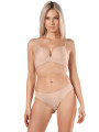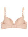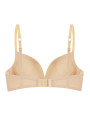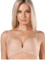The Mefemi Amelia push-up bra is a beige wireless women's lingerie piece featuring smooth molded cups and a deep plunge neckline. This wireless push-up bra provides significant lift and centering using integrated foam padding, offering the shape of a wired bra with the comfort of a soft cup. Designed to be invisible under tight clothing, it combines a seamless finish with a small gold decorative detail at the center.