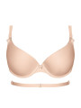 The Mefemi Ismena 02 push-up bra is a convertible underwired women's lingerie piece featuring smooth molded cups and a versatile strap system. This beige push-up bra lifts and shapes the bust using fixed foam padding while the specialized low-back converter allows for wear with backless dresses. A practical solution for difficult necklines, this model combines a seamless look with reliable support for special occasions.