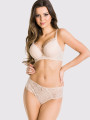Removable décolleté straps and integrated push-up padding make the Mediolano Julia 19167 a standout choice for those seeking a significant lift. This super push-up plunge bra in warm ivory lace over a powder beige base is available in extended cup sizes from A to E. This piece of European lingerie brings the bust together at the center to create a striking neckline.