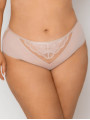 Brief panties are redefined in the Mediolano Amelia 19201 through a striking contrast between solid microfiber hips and a fully sheer tulle rear. These light beige panties feature a central V-shaped cutout at the front waist, showcasing a delicate botanical lace applique that adds a decorative touch to this Polish lingerie.