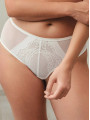 The Mefemi Dalia hipster panties are high-waisted women's underwear designed to combine coverage with sheer aesthetics. These ivory lace briefs feature breathable mesh side panels and a decorative floral back that frames the glutes. With a soft cotton gusset and elasticated waist, they provide secure daily support without digging into the skin.