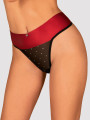 The Obsessive Tienesy thong is a bold and classy piece of women's lingerie designed for confident women who enjoy playful designs. This red and black thong features a striking satin waist and a silver trinket for added charm. Crafted from sheer fabric with shiny dots, this black thong offers a festive and alluring look.