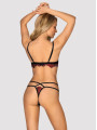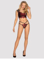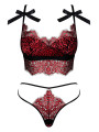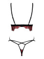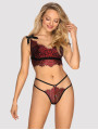 The Obsessive Redessia set is a luxurious piece of women's lingerie designed for confident women. This red set features floral lace with black lining and elegant satin bows on the shoulders. The red lace top provides a beautiful silhouette, while the matching lingerie thong uses elastic straps to emphasize the hips.