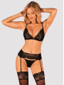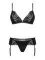 The Obsessive Maderris lingerie set is a sensual three-piece collection of women's lingerie designed for a confident look. This black lingerie set features a soft-cup bra, a matching garter belt, and a sexy thong. The floral lace details and smooth fabric provide a beautiful aesthetic for any romantic occasion.