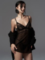 - Sheer Mesh Fabric — Breathable black mesh creates a transparent haze that fits comfortably on the body.