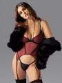 The Obsessive Exquisite Parisel corset is a classy piece of women's lingerie designed for romantic evenings. This burgundy corset features sheer mesh fabric with black contrast trim to highlight your curves. The structured design includes underwired cups for support while the matching thong completes this elegant burgundy lingerie set.